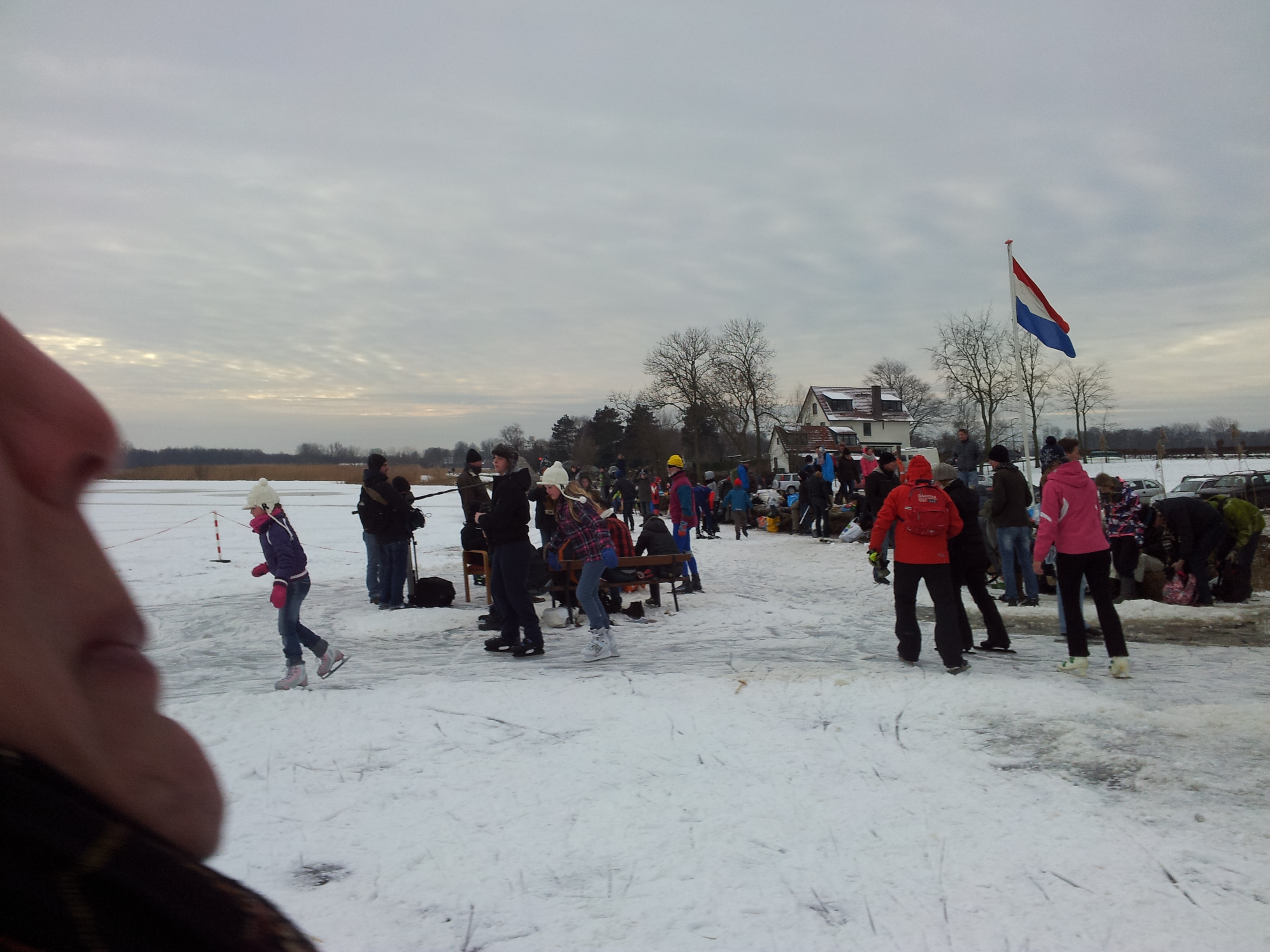 Schoen leeggegoten, en sok maar uit, even flink uitgewrongen en in mijn broek. Aan de waterkant mijn sok weer aangetrokken en met veel moeite mijn schaatsen aangedaan.