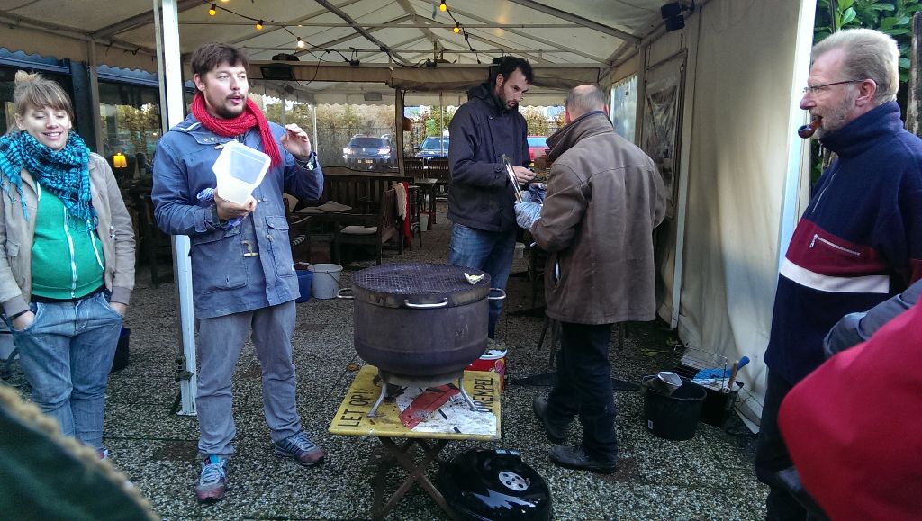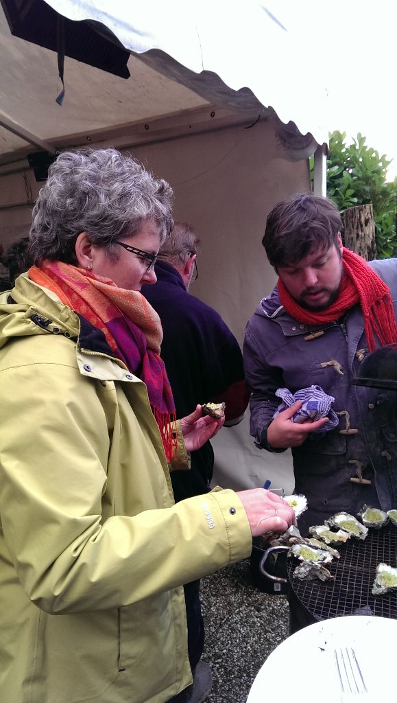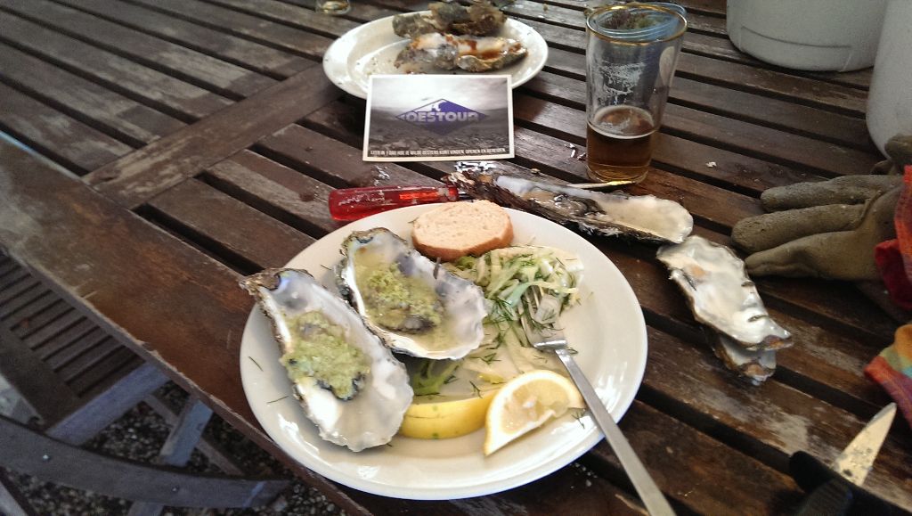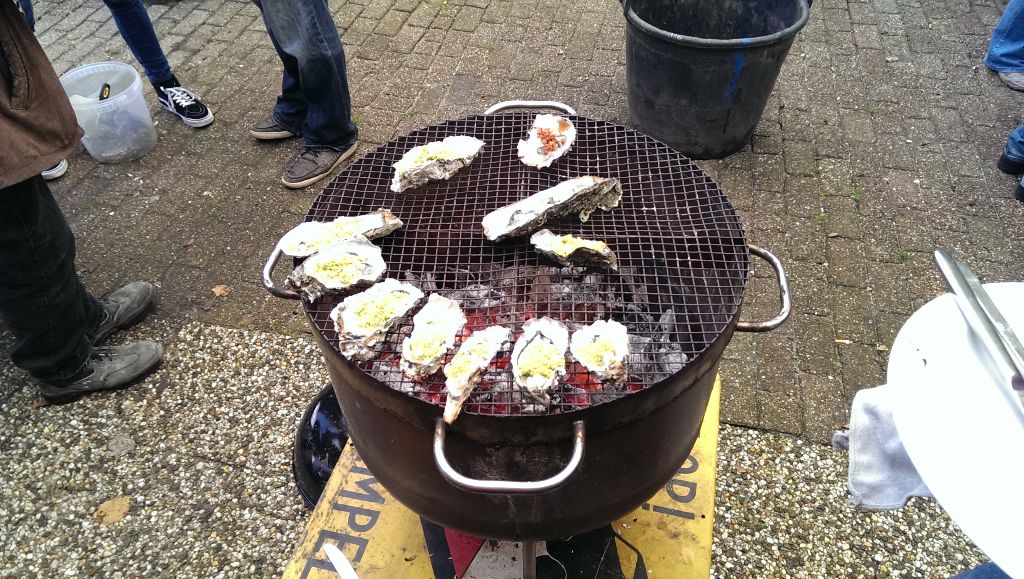 Nadat we de oesters geraapt hebben (inclusief de natte voeten omdat het water wat hoog stond voor sommige deelnemers konden ze gespoeld worden. Daarna kregen we uitleg hoe de oesters te openen en kon het feest van de bereiding beginnen. Op de BBQ en oestersoep met daarbij een drankje en salades en stokbrood.
