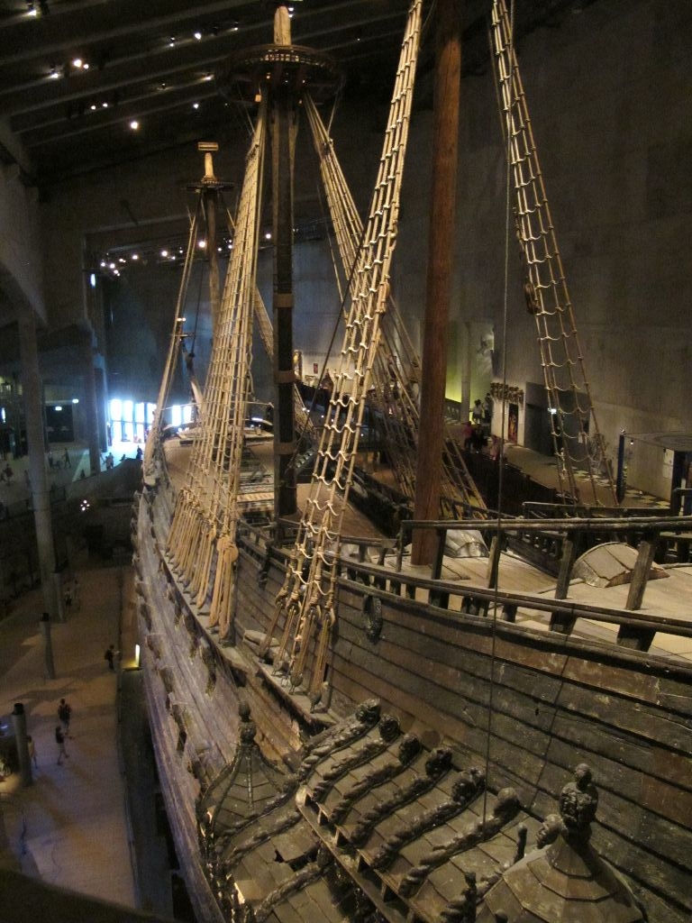 Nadat we gisteren inderdaad nog onder een brug doorgingen, zijn we gaan slapen. Vanmorgen lekker ontbeten en op het dek gekeken hoe we Gothenburg binnen voeren. Daarna een stevig stuk door Zuid-Zweden gereden naar Stockholm. Rechtstreeks naar het Vasa museum. Daar ligt een boot die in 1628 in de haven is vergaan. Ze waren niet verder gekomen op hun eerste reis, wel een beetje sneu! Dat schip is na 333 jaar uit de haven opgevist en staat nu helemaal gerenoveerd in het museum. Een enorm schip, en daarbij een heleboel uitleg. Bijvoorbeeld welke kleren de bemanning droeg, welke kleurpigmenten er op het schip waren gevonden waaruit ze konden opmaken in welke kleuren het schip had. En ook een stuk over hoe ze uiteindelijk het schip boven water hebben gehaald.