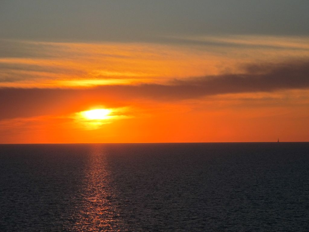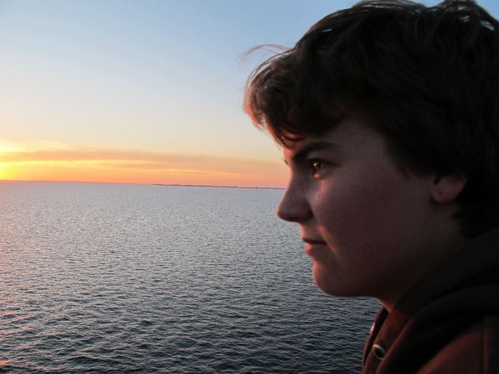 Wat een enorm schip, je hebt de gps nodig om je hut terug te vinden. We hebben eerst boven op het dek staan kijken hoe (eindelijk) de trossen los werden gegooid rond kwart voor zeven. Daarna heerlijk gegeten van het buffet. En toen we weer naar buiten gingen, was het heerlijk toeven op het dek, en konden we genieten van een prachtige zonsondergang. Toen het wat frisser werd, zijn we naar binnen gegaan. Nu is het wachten op de brug, waar we, volgens Eelco, straks onder door varen (hij heeft ook bruinvissen beloofd, maar die hebben we ook nog niet gezien).